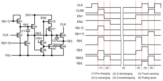 Thus, the shift registers that can support TDDM should be able to start the pulse generation again after stopping during the touch sensing intervals, as presented in Figure 20, to get rid of display noises at the touch detection. The display noises are controlled during the touch sensing operation by shutting down clock pulses. Low-voltage EN1 and EN2 signals indicate the touch sensing interval, and A[n] stores the information about the pre-charging at the n-th line right before the touch sensing period starts. A[n] is pre-charged through N1 by the previous output (G[n − 1]), and then Q[n] is pre-charged via N3 when EN1 is high. Meanwhile, when EN1 is low during the touch sensing period, Q[n] is discharged to VGL, but A[n] maintains its pre-charged voltage at C1. After the touch sensing interval ends, high EN1 triggers the pre-charging at Q[n] by the high voltage stored at A[n], and then the bootstrapping takes place at Q[n] by the rising transition of CLK, generating G[n] without any voltage losses.