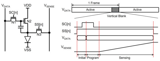 While LCDs adjust the pixel luminance by voltage, OLED displays control it by current. Because the source drivers provide the pixel data with the voltage signals, pixel circuits in OLED displays contain driving TFTs to convert pixel voltages into currents. Therefore, the variation on the characteristics of driving TFTs causes visible artifacts on the screen. In addition, the degradation of the OLED efficiency is also perceived as an image sticking phenomenon. To compensate for these artifacts, internal and external compensation methods have been developed. While the internal compensation is categorized into voltage programming and current programming for the compensation of the TFT variation [117,118,119,120,121], the external compensation scheme can address TFT variations as well as OLED degradation to meet the requirement of the long lifetime in large display applications. The pixel circuits based on external compensation methods includes a sensing TFT (N3) to sense the characteristics of TFTs (N2) and OLEDs, as described in Figure 21 [122,123,124]. After the full scanning for a frame of the image is finished, the sensing operation for pixels of one line is conducted in the vertical blank to secure enough sensing time. The sensing operation gets to cover the whole pixel data by selecting another line in a frame-by-frame way. The control signals (SENSE) to turn on sensing TFTs are generated by the additional circuits in gate drivers, and the line selection should be able to be randomly fulfilled in order to avoid perceivable artifacts, as shown in Figure 22 [125,126].