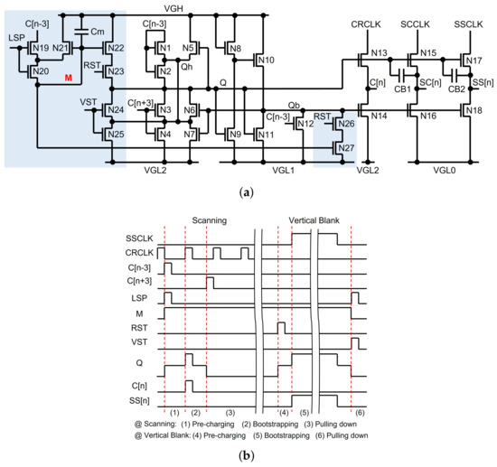 An example circuit supporting the random sensing pulse generation is illustrated in Figure 23a [125]. The timing diagram is also described in Figure 23b, where an n-th line is selected to store the high M-node voltage during the scanning operation and to generate its sensing pulse (SS[n]) during the vertical blank. When LSP is asserted at the high pulse of C[n − 3] in the scanning period, the M-node is charged to the high voltage that is held in the capacitor, Cm. In the vertical blank, while the high pulse of RST causes the pre-charging on the Q-node through N22 and N23, it also pulls down the Qb-node through N26 and N27. Then, the high pulse of SSCLK is transferred to SS[n] without the voltage loss by bootstrapping. Both following high pulses of RST and VST discharge M and Q, pulling Qb up. Because LSP pulses are generated randomly by a timing controller, the random sensing pulse generation is accomplished.