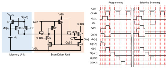 One selective scan driver is illustrated in Figure 24, which consists of a memory unit and a scan driver unit. The scan driver unit is a shift register, where Q[n] can be pre-charged by G[n − 1] and through N9 and N10, respectively. Since the Programming period maintains OE at the high level, Q[n] is pre-charged by G[n − 1], resulting in the generation of all scanning pulses. When the high pulse of is applied at an (n − 1)-th line timing of the high G[n − 1] pulse, a Me[n]-node is charged to the high voltage held at Cm, turning on N10 in the n-th circuit. Since the following frame does not apply a start pulse to the first stage, the scanning pulses do not take place. However, when the high pulse of and the low pulse of OE are applied, the n-th shift register with the high-voltage Me[n]-node pre-charges Q[n] and generates the high pulse of G[n]. Consequently, the following stages give rise to consecutive pulses until another low pulse of OE is applied. Since this low OE pulse blocks the input signal (G[n − 1]) from the previous shift register by turning off N9, output pulses are not produced anymore. Therefore, the specific pulse generation region is programmed, and the remaining region is displayed by the pixel data updated in the previous frame without scanning pulses.
