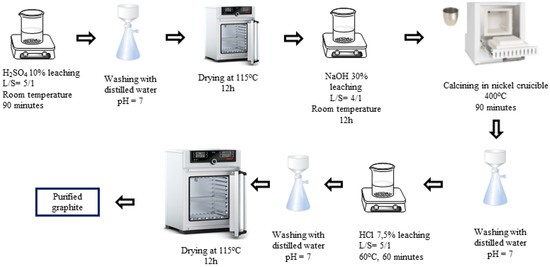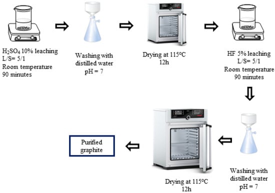 The wet chemical refinement method involves using certain chemical types to dissolve the minerals’ impurities [19]. For graphite minerals, some commonly used chemicals for impurity removal are H2SO4, HNO3, and HCl acids [14,20,21]. Using these chemicals can yield graphite with a carbon content > 95%. Silicate impurities are the most difficult to handle in graphite, and HF is commonly used to remove this impurity group. However, HF is highly environmentally toxic when applied on an industrial scale [22]. Therefore, many alternative chemicals have been researched to remove silicate instead of HF, and NaOH is a potential cleaning agent. Some studies have utilized a mixed process of H2SO4/H2O2–NaOH–HCl to purify graphite, achieving purity levels of up to 99.68% [3]. Additionally, a two-step alkaline–acid cleaning process has been researched, with the carbon content reaching up to 98.6% [21]. However, most of the purifying processes focused on flake graphite.