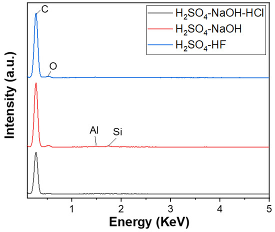 The research of Jara et al. identified the optimal method for refining graphite to achieve a carbon content of over 99% as the 3-step process H2SO4/H2O2–NaOH–HCl; this method is equivalent to the first method in this study [15]. However, the graphite used in this study is in the form of spheres, which is different from the flake graphite, and H2O2 is a strong oxidizing agent, which may produce SO2 gas and cause the spherical particles to swell when combined with H2SO4. Furthermore, H2O2 can expand the material into a 2D form [28], which contradicts the expectation of maintaining the spherical shape of graphite particles. Therefore, H2O2 was not used in this study. From these results, the three-step process of H2SO4–NaOH–HCl could be considered the most optimal purification method for spherical graphite.