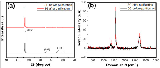 Figure 6a shows the XRD results of SG1 and SG2. Before and after purification, both materials exhibited characteristic peaks at an angle of 2θ = 26.5°. Compared with some XRD results of natural graphite studied worldwide, the XRD pattern of the reference material also showed a characteristic peak at 2θ = 26.5° [29]. This indicates that, before treatment, the SG1 was graphite with an hcp structure [30], as evidenced by the characteristic peak at 2θ = 26.5°. After purification, the product SG2 remained graphite and retained its original structure, as there was still a characteristic peak at the corresponding 2θ angle, without any additional peaks. The Raman results, as shown in Figure 6b, clearly indicate that the carbon peaks of SG after purification were higher than that of SG before purification, demonstrating that the carbon content of SG after purification was higher than that of SG before purification.