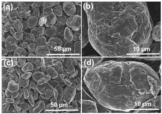 SEM images of SG1 and SG2 are shown in Figure 7. Before treatment, the graphite (SG1) exhibited spherical shapes with uniform sizes, and the diameter was approximately 20 µm. After cleaning, the graphite particles (SG2) were still spherical and maintained uniform sizes. Additionally, the material’s surface was rougher and contained more holes and defects because of the dissolution of the impurities in the initial spherical graphite. This demonstrates that the purification process cleaned the graphite particles effectively without affecting their spherical shapes.