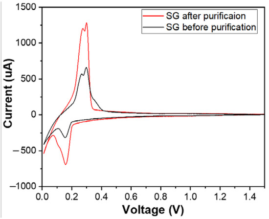 Figure 10 shows the cyclic voltammetry (CV) curves of materials SG1 and SG2. Both CV curves exhibited complete oxidation peaks (at a potential of 0.26 V) and reduction peaks (at a potential of 0.15 V), and they also had similar shapes to the CV curve or similar electrochemical behaviour of the natural spherical graphite in another study [31]. This demonstrates that the researched materials possess the electrochemical characteristics typical of graphite electrode materials for Li-ion batteries. The intensity of the oxidation and the reduction peak after purification increased, which shows that the purification process enhanced the conductivity of the graphite material.