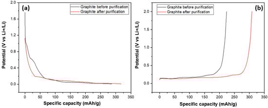 0.5 g of the spherical graphite before (SG1) and after (SG2) purification was mixed with a binder PVDF and a conductive supporter Super P in a mass ratio of 8:1:1. After the mixing step, the mixture was rolled onto a copper foil. Then, the electrode sheet was dried at 50 °C for 12 h and vacuum-dried for 8 h at 90 °C. After that, the sheets were cut into the circle electrodes with a diameter of 1.1 cm. These electrodes were assembled into the coin cell battery model CR 2032, and the electrochemical characteristics were evaluated through cyclic voltammetry (CV) and galvanic charge discharge (GCD) measurements using a WonaTech WBCS 3000 device (WonaTech, Seoul, Republic of Korea).