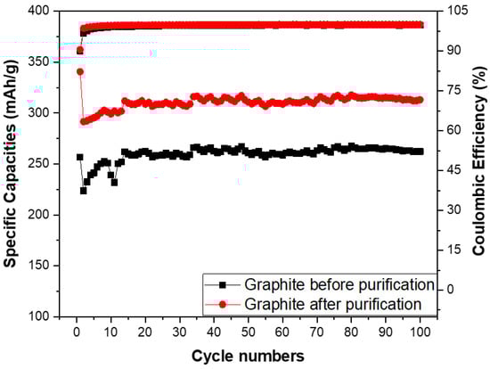 The specific capacities and coulombic efficiency of the anodes made from the spherical graphite before and after purification were investigated through over 100 cycles, as shown in Figure 12. The coulombic efficiency of both samples stabilized at approximately 99% from the second cycle onwards, with an initial value of 90% in the first cycle due to the formation of the SEI film. Regarding specific capacity, the SG2 material maintained a stable specific capacity of 300 mAh/g throughout the 100 cycles, while the electrode using SG1 material had a specific capacity below 300 mAh/g. This is lower than the value for the graphite with over 99% carbon content and significantly below the theoretical specific capacity of graphite (372 mAh/g). These results indicate that purifying spherical graphite to achieve a carbon content greater than 99% is essential for its application as an anode material in Li-ion batteries.