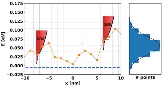 A schematic representation of the band-edge landscape and its concrete elements along a 1D cross-section. Gridding along the x-axis represents the Voronoi volumes associated with each mesh point along the cross-sectional line (squares), the orange line represents the band-edge at each point, and the dotted blue line is the Fermi level. The gridding along the y-axis represents energy ranges and corresponds to the histogram on the right showing the total number of mesh points with band-edges falling in the range between any given y-grid lines. Note that the histogram is representative of a much larger set of points than is shown in the figure, which is too small a sample for clear statistics. Finally, at any and all mesh points, we imagine a density-of-states (DOS) that includes the free and bound carriers centered around the band-edge energy at that mesh point.