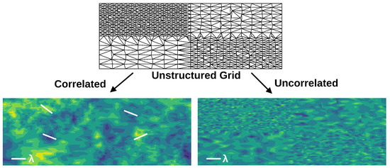 A schematic drawing of the field generated using a Gaussian random field (GRF) versus a completely uncorrelated field for an unstructured mesh constructed to have regions of noticeably different gridding. In the GRF, the characteristic size of fluctuations is agnostic to the gridding (provided the gridding is much finer than the correlation length), whereas for the uncorrelated result, it is visibly not agnostic to the gridding. This is further highlighted by the white lines in the correlated image that show some sample “hills” and “valleys” of a consistent size.