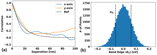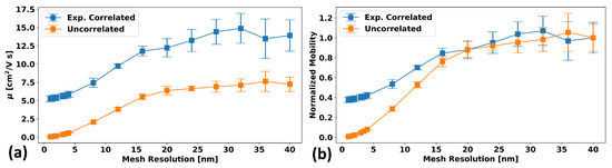 Once the above algorithm is performed (again, see Appendix A for a detailed derivation of this algorithm), the result is a field with the desired properties. Figure 3 and Figure 4 demonstrate this for a sample GRF generated using this algorithm. Figure 3a shows that the generated GRF does indeed manifest the desired spatial correlations: in this case, exponentially decaying correlations with a correlation length of 20 nm are used, and the expected behavior is shown as a dotted black line. Figure 3b shows that the band-edge values at each vertex also follow the probability distribution dictated by Equation (1). Figure 4a considers the differences in the means and standard deviations of the calculated mobility for 10 different randomly generated GRF samples for the case of exponentially correlated and uncorrelated spatially varying band-edges as a function of grid size for a fixed system size. The model parameters and procedure used for the determination of the mobility are discussed in Section 2.3. It can be seen that a correlated model approaches saturation to a final finite value with minimal variation with sufficiently small gridding, whereas the uncorrelated approach saturates to zero mobility. Based on these results, it would seem that for mesh resolutions below approximately half the correlation length (10 nm here), the mobility reaches an acceptably saturated value with quite low variation. This implies that a mesh resolution of or finer is desirable for simulation. Figure 4b is the same data as (a), only plotted with mobility values and standard deviations normalized to the large grid size (i.e., right-most) value.