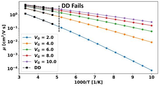 Mobility versus inverse temperature for different gate voltages with the parameters in Table 1 for a drift diffusion (DD)-based simulation versus one using quasi-Fermi-level transport (QFT). It can be clearly seen that for temperatures below ∼200 K, the DD-based solver fails to converge, and no value can be obtained; but the QFT approach yields sensible results. It can also be seen that both approaches produce identical results at higher temperatures.