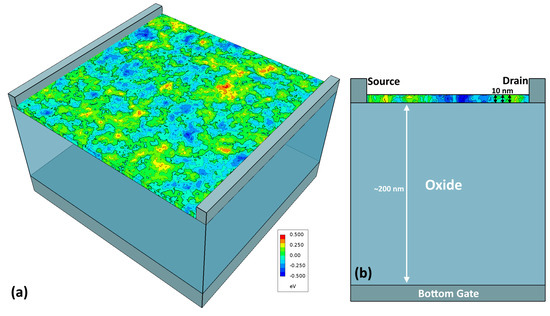 (a) A 3D diagram of the device simulated in Section 2 showing the spatially varying band-edge of the a-IGZO film generated using the procedure described in Section 2.1. (b) A 2D cross-section of the same device showing a 200 nm-thick oxide layer () and a 10-nm thick a-IGZO layer () on a back-gated device with Schottky/undoped source and drain contacts.