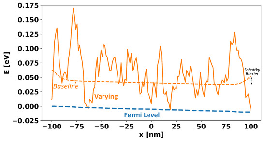 As a result of these workfunctions, there is a certain non-uniform baseline band-edge reflecting only the Schottky contacts and gate workfunction, onto which the additional Gaussian band-edge variation is added. A 1D cross-section from the source to the drain of these two band-edges is shown in Figure 7.