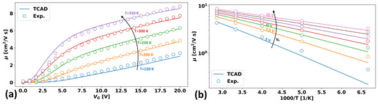 Thus, the set of fixed values is , , , and , and the set of fittable parameters is , , , , and . Experimental reference values were extracted directly from Figure 4 of [5], and an optimization algorithm was run to optimize the TCAD model to match that data set. The final optimal values are listed in Table 1, and the resulting fits are shown in Figure 8a,b, which are the same data values plotted with different x-axes in order to highlight the gate voltage dependence and the temperature dependence of the mobility, respectively.