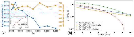 (a) Calculation time comparison of analytically evaluated vs. numerically integrated band-tail charge densities as a function of the inverse of the number of mesh points, n, in the device mesh. The left y-axis shows the percent of total simulation time dedicated to the analytical calculation (blue), and the right y-axis shows the speed-up of analytical evaluation compared to numerical integration (orange). The inset shows a negligible difference in the output mobility values for both methods as a function of system size. (b) Mobility as a function of inverse temperature for cases with (orange and red) and without (blue and green) band-tails and cases with (orange and blue) and without (red and green) a spatially varying band-edge.