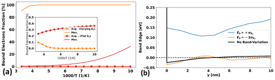 Figure 9b shows how the mobility varies as a function of the inverse temperature at a high gate bias of 20 V in the case where there is no trapping band present versus the case where there is one with a density-of-states constant of m (1.6 ) and a of 770 K. Additionally, the difference between a varying band-edge (using the parameters from Section 2.3) versus a flat non-a-IGZO-like band-edge are shown. It is immediately clear that the presence of a varying band-edge significantly changes the quantitative and qualitative behavior of the temperature dependence of the mobility.