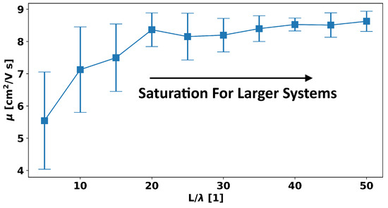 where L is the system length and W is its width (here, in both cases, 200 nm), and is the capacitance of the oxide layer. and are the drain current and bias, respectively (in all simulations, a of 0.01 V was used), and is the gate voltage, which varied from 0 V to 20 V.
