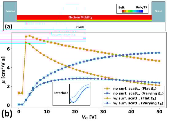 (a) A cross-sectional diagram showing the spatial variation in the mobility as a function of the distance from the semiconductor–insulator interface. (b) Mobility vs. for the cases of varying (blue) and unvarying band-edges (orange) for the cases of uniform mobility (dotted squares) and surface-reduced mobility (circles with solid lines) models. The inset depicts a proposed reason for the reduced surface scattering in the varying band-edge case, as the carrier may favor deeper valleys (darker blue, solid) that are further from the interface over shallow valleys (lighter blue, shallow) that are closer.