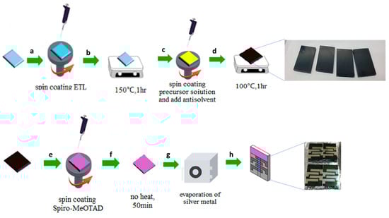 The schematic representation of fabrication of perovskite solar cells (a) deposition of MoS2; (b) annealing process; (c) coating of perovskite absorber; (d) annealing process; (e) doposition of hole trasport material; (f) drying process at room temperature, (g,h) coating of Silver as back contact.