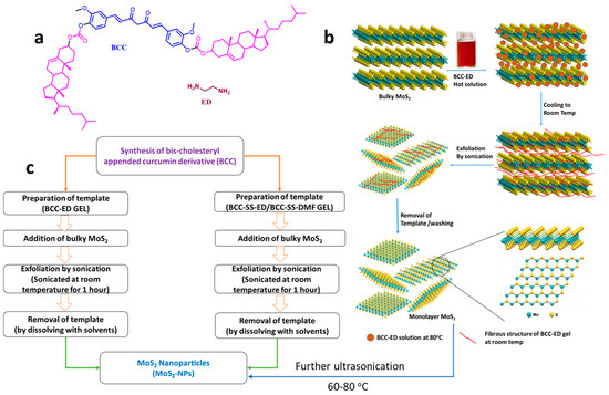 The schematic representation of initial exfoliation of MoS2 to few/monolayer MoS2 using bis-cholesteryl-appended curcumin derivative (BCC) with ethylene diamine (BCC-ED) and further treatment under strong ultrasonication at higher temp, leading to NPs, are shown in the Figure 2.