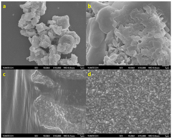 The synthesized MoS2 were characterized by morphological analysis using SEM, and the morphologies were merged in Figure 3a–d. It was observed that after 1 h of sonication, separation/breaking of the multi-layers of MoS2 to few-layers occurred. Successive sonication with BCC-ED and curcumine-ED for 3 h resulted in a similar morphology (Figure 3c,d). The entangled fibrous structure of BCC-ED gels was observed in the BCC-ED exfoliated MoS2 (Figure 3c). However, pure MoS2 was observed in the curcumine-ED exfoliated MoS2. Moreover, the platelets or nanoparticles of MoS2 were in the size of a few nanometers (approximately 100 to 400 nm). This morphology is in accordance with the reported morphology of MoS2 in the literature [24,25], in which MoS2 was exfoliated using a high-temperature process, whereas we used a room-temperature process with the help of sonication, indicating the successful exfoliation of the MoS2.