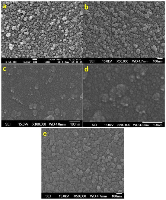 In the figure, rough surfaces with random-sized nanoparticles are observed for ED-treated MoS2 (Figure 4a). However, uniform particles are observed for C-ED-treated samples, indicating that curcumin plays an important role in the exfoliation and further breaking of MoS2 into NPs (Figure 4b). Hence, the agglomeration or clustering of nanoparticles was observed, which may be due to the presence of excess curcumin or ED as impurities or curcumin-induced aggregation [26,27,28]. The repeated washing with excess DMF and the ultrasonication process led to well-organized MoS2 nanoparticles with a size of approximately 10 nm being observed (Figure 4c–e), indicating the synergistic effect of curcumin and ethylene diamine [26,29]. Exfoliation of MoS2 to single or few-layered nanosheets is expected; however, instead, we observed nanoparticles in all the cases, which may be due to the prolonged ultrasonication causing the breaking of sheets into nanoparticles [1,30].
