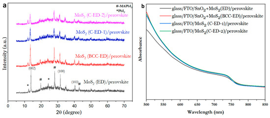 X-ray diffraction patterns (a) and the absorption spectra (b) of the perovskite layer consisting of MoS2 NPs, prepared at different conditions.