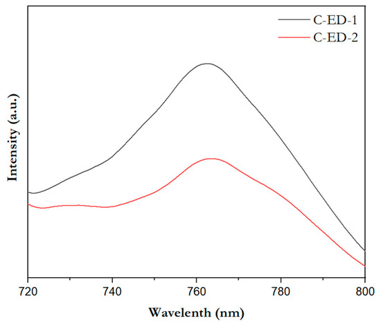 To figure out the photoconversion process/charge transfer process associated with the quality of MoS2 in the perovskite films, the photoluminescence was recorded for the above said samples, and the results are merged in Figure 6. Here, the excitation wavelength of 400 nm is used, which is the specific excitation wavelength of perovskite (CsFAMAPbI3−xBrx). From the figure, it can be seen that the photoluminescence spectrum of perovskite generates energy around the emission wavelength of 750 nm. The PL intensity of the perovskite thin film sample prepared from the MoS2 ETL separated by C-ED-2 showed a significant decline than that of C-ED1, suggesting that C-ED-2 promotes electron extraction and transport capacity at the MoS2/perovskite interface through multiple interaction systems.