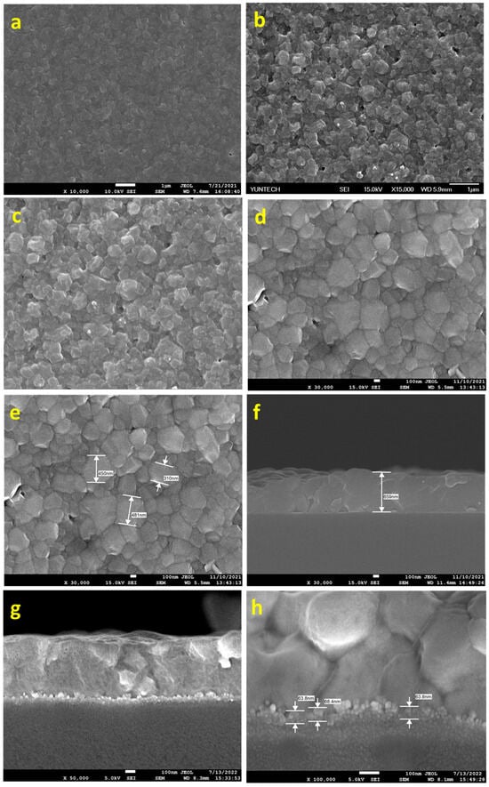 SEM morphology of perovskite layer consisting of different MoS2, (a) ED, (b) BCC-ED, (c) C-ED-1, (d,e) and C-ED-2, and (f) cross-sectional SEM image of Figure (e); (g,h) cross-sectional SEM image of the perovskites with MoS2 layer (C-ED-2) thickness.
