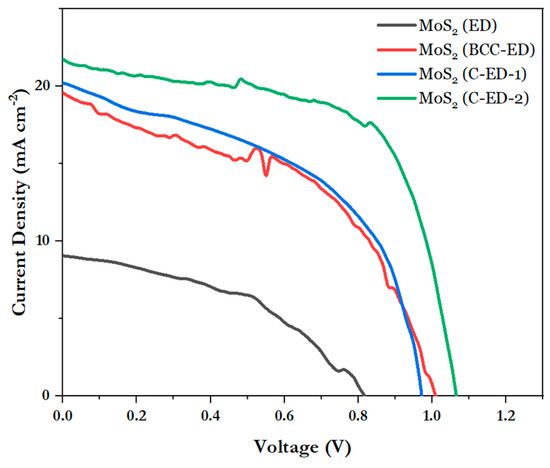 The J-V curves of the perovskite solar cell with MoS2 as an electron transport material, prepared in different ways, are shown in Figure 8 and Table 1. It can be seen that ED-treated MoS2 solar cells exhibited low efficiency (4.39 ± 0.81) in the structure of FTO/ETL/perovskite/spiro-OMeTAD/Ag, and the curves were also very poor, which is due to the uneven particle size and the uneven surface of the electron transport layer, resulting in poor crystallization of the perovskite layer. Moreover, the MoS2 layer was not completely covered by the perovskite layer, and only moderate crystal growth of the perovskite layer was observed, as evidenced by SEM. Moreover, the surface of the perovskite layer was seemingly rough, with irregular packing of crystals, which may be due to the rough surface of the MoS2 layer. From the morphology of neat MoS2, it can be seen that the surface is not smooth, which may lead to poor packing of the perovskite layer, thus causing poor PCE. In the case of BCC-ED-treated MoS2-based devices, which exhibited better performance (PCE: 9.46) than ED, indicating that BCC improved the quality of the perovskite film by reducing the defects significantly. Interestingly, C-ED-treated MoS2 cells (C-ED-1 and C-ED-2) enhanced efficiency significantly because the smooth and uniform particles of MoS2 improved the quality of the thin film. Repeated washing or removal of excess curcumin improved the fill factor (FF) from 56 to 58%, as well as the open circuit voltage (Voc) from 0.94 to 1.05, revealing that C-ED-2 significantly enhanced the efficiency by reducing the recombination rate. This indicates that the quality of MoS2 plays a crucial role in the PCE of the devices. The high-quality MoS2 offers the best platform for perovskite film formation as well as a template for crystal growth, which is supported/consistent with SEM results. Therefore, any impurities like curcumin/ED that exist reduce the crystallinity of perovskite and increase the defects leading to poor efficiency. Because a larger crystal size also means lower crystal defect density and trap sites existing in the thin films, which is beneficial for efficient charge transport and reduced charge recombination. The study of the stability of the fabricated devices and other characterizations is in progress.