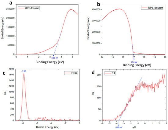 For further insights regarding the improved performance, especially the low voltage loss, the effect of MoS2 on the energy levels of the perovskite films was examined with ultraviolet photoemission spectroscopy (UPS). The UPS experiments probe the vacuum, Fermi, and valence energy levels near the perovskite layer, where electrons are extracted in the working solar cells. The value of the work function was calculated using the equation: WF = 21.2 − Ecut-off in which Ecut-off is the energy of emitted secondary electrons and 21.2 eV is according to the He laser UV light source [41].