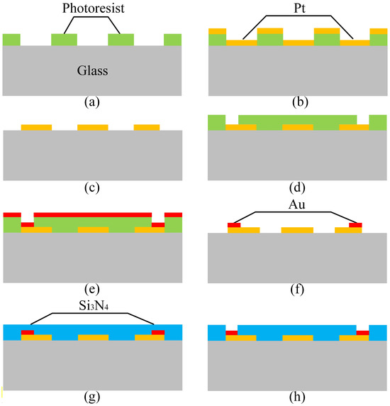 Figure 2. The fabrication process of the MEMS thermal convective accelerometer. (a) Patterning on the glass wafer. (b) Depositing Pt film. (c) Lifting off to create the heater and thermistors. (d) Patterning on the glass wafer. (e) Depositing Au film. (f) Lifting off to define the pads for wire bonding. (g) Depositing Si3N4 to form the passivation layer. (h) Etching the passivation layer to expose the pads.