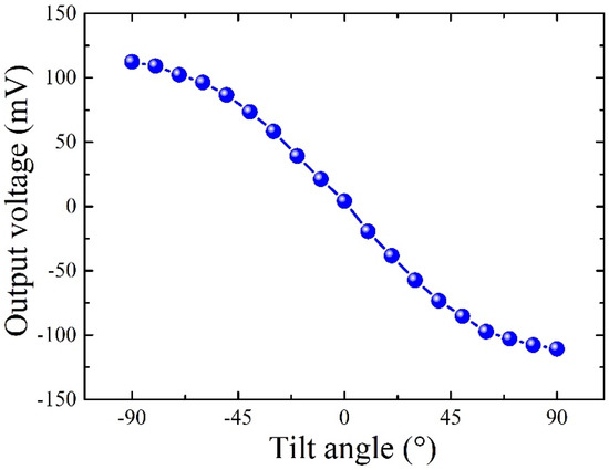 Figure 4. The tilt angle test results of the MEMS thermal convective accelerometer when the sensor rotates from +90° to −90° around the central axis of the heater.