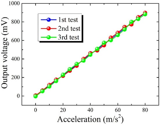 In addition, the accelerometer was placed horizontally, and subjected to acceleration perpendicular to the central axis of the heater. The experimental shaking table setup was used to measure the output voltage variation of the accelerometer at different accelerations. The experiment was repeated three times on the same chip with an input acceleration range of 0 to 80 m/s2, and the corresponding results are shown in Figure 5. It can be observed that the sensor is capable of measuring accelerations exceeding 80 m/s2. Within this measurement span, the output voltage of the device exhibits almost linear variation with increasing input acceleration and demonstrates commendable repeatability.