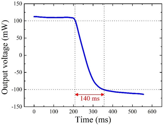 Furthermore, the response time of the thermal convective accelerometer was evaluated by activating the heater in constant voltage (CV) mode. During this evaluation, the sensor was subjected to rotational maneuvers around the central axis of the heater, inducing an abrupt shift in tilt angle from +90° to −90°. The microcontroller recorded the subsequent variations in output voltage, meticulously portrayed in Figure 6. In this context, the response time signifies the duration necessary for the output voltage to transition from 90% to 10% of its maximum value as the tilt angle oscillates from +90° to −90°. Notably, the data delineate a response time of approximately 140 ms, underscoring the swift and precise responsiveness of the sensor to dynamic environmental changes.
