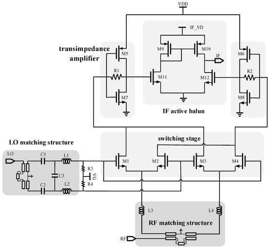 The down-conversion mixer structure is shown in Figure 1, which mainly consists of the switching stage, matching structure, IF transimpedance amplifier, and IF active balun. The switching stage utilizes a Gilbert cell designed to achieve high port isolation, simultaneously enabling differential input and output [8]. The matching stage uses an on-chip Marchand balun to realize the conversion of single-ended signals to differential signals with broadband impedance matching. In order to improve the conversion gain of the mixer, a trans-impedance amplifier that reuses the current from the switching stage is employed, and it also achieves the conversion of the output current signal of the switching stage into a voltage signal. The IF active balun is a differential amplifier with current mirrors acting as loads to realize the conversion of differential signals to single-ended signal outputs and provide additional gain.
