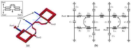 Figure 3. The 3D structure (a); simplified equivalent circuit model (b) of the Marchand balun.