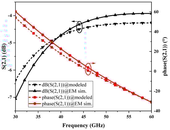 Based on the structure of the Marchand balun, its simplified equivalent circuit model can be proposed as shown in Figure 3b, where LP1 and LS1 are the self-inductance of the primary and secondary coils, k is the coupling coefficient between the primary and secondary coils, RP1 and RS1 are the parasitic resistances of the primary and secondary coils, CC is the coupling capacitance between the primary and secondary coils, CP1 and CS1 are the parasitic capacitances between the coils and the substrate, and LC is the inductance of the compensating line; the values of the parameters of each device are shown in Table 1. The main parameters of the Marchand balun used in the matching network include a line width of 2 μm, a line gap of 2 μm, and an outer width of the coil of 42 μm, and the number of coils is 1.75 turns. The equivalent circuit model of the Marchand balun is compared with the electromagnetic (EM) simulation results, as shown in Figure 4, and the model can fit the EM simulation results well.