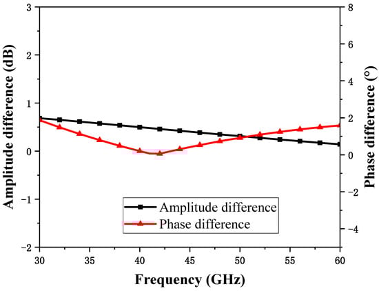 The broadband baluns used at the RF and LO ports have the same sizes, and their amplitude-phase balance characteristics in the operating frequency band are shown in Figure 5. It can be observed that, in the frequency range of 30~60 GHz, the amplitude imbalance of the balun is less than 0.7 dB, and the phase imbalance is less than 2°. The simulation result demonstrates that the balun structure has a good amplitude-phase balance characteristic under a wide frequency band and has a small size, with an area of only 155 μm × 42 μm.