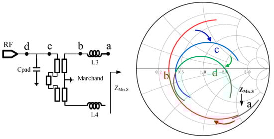 While designing the Marchand balun structure, it is also necessary to comprehensively consider the impedance matching design with the mixing core unit. Taking the RF port matching network as an example, a matching network composed of a series inductor, Marchand balun, and capacitor can be used, and its matching structure and matching conversion path are shown in Figure 6. Among them, the inductor L3 has 1.5 turns and a 31.5 μm inner diameter, with a line width and spacing of 3 μm and 2 μm, respectively, and its inductance is approximately 170 pH. The Cpad is the PAD parasitic capacitor with a capacitance of 27 fF. It can be found that the matching network can realize the matching design in the broadband operating range from 30 to 60 GHz, and it is characterized by a simple structure and compact area.