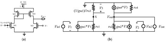 The equivalent small-signal model of the circuit is shown in Figure 7. gm1, gm2, and gm4 are the trans-conductance of the M1, M2, and M4 transistors, respectively, and ro1, ro2, and ro4 are the channel resistor of the M1, M2, and M4 transistors, respectively, with rd = (1/gm1)//ro1. The small-signal model of the M3 transistor can be equivalent to the resistance value of (1/gm3)//ro3 (gm3 is the trans-conductance of M3, and ro3 is the channel resistance of the M3 transistor). This can be obtained from Figure 7: