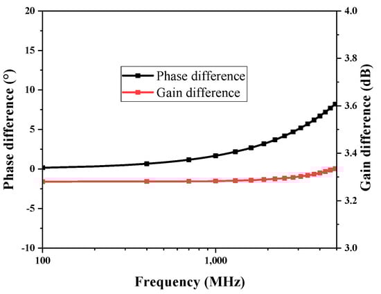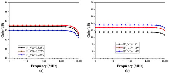 When 2roPgmP + 2roPgmP >> 1, the voltage gain of this circuit can be approximated as AV = gmN(roP//roN); therefore, it is necessary to rationally design the trans-conductance of the M1 and M2 transistors to obtain a suitable gain. Since the diode-connected PMOS device consumes a certain voltage margin, the circuit needs to be at a higher voltage, but the higher the voltage, the higher the power consumption; therefore, a compromise is needed. Figure 8a shows the gain of this active IF balun at different gate voltages; it can be observed that the output DC voltage of the front-connected trans-impedance amplifier 0.625 V is a more appropriate input gate bias for this active IF balun, and ±0.1 V change, there is only a gain drop of 0.55 dB. Figure 8b shows the gain of this active IF balun at different drain voltages; the gain is considered in trade-off with the power consumption, take IF_VD = 1.4 V, and the DC power consumption is 23.5 mW. The gain variation caused by bias conditions can be compensated in other circuits of the receiver system to achieve stable gain amplification. Due to the asymmetry of the structure of this active balun circuit, the gain and phase balance performance is slightly weak, as shown in Figure 9. In the frequency range of 0.1 to 1 GHz, the phase imbalance is 1.6°, and the gain imbalance is approximately 3.3 dB.