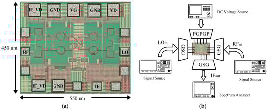 The down-conversion mixer is designed in a 65 nm CMOS technology with the total area of 0.55 × 0.45 mm2, and the chip photo is shown in Figure 10a. The mixer is tested using chip-on-board, and the test scheme is shown in Figure 10b. Among them, the RF and the LO use an Agilent E8257D signal source and a Ceyear 1465L signal source, respectively, to provide millimeter-wave signals, and the output is tested using an Agilent E4440A Spectrum Analyzer. The RF, LO, and IF use ground-signal-ground (GSG) probes to input or output the signals, and the bias conditions given are VG = 0.3 V, VD = 1 V, and IF_VD = 1.4 V.