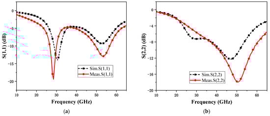Figure 11. Mixer RF (a) and LO (b) port S-parameter test and simulation results.