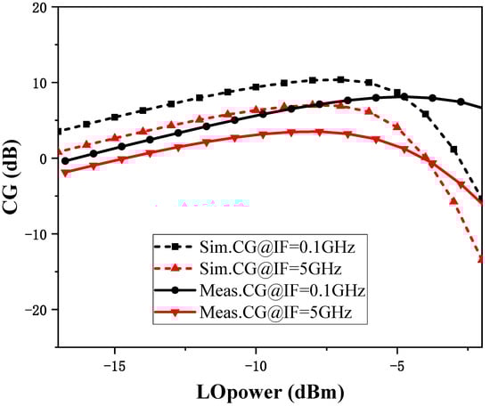 Figure 11 shows the S-parameter comparison of the measurement and simulation between the RF and LO ports of the mixer, and it can be observed that these two results have good consistency. When testing frequency conversion characteristics, it is necessary to first determine the appropriate LO driving power. Figure 12 shows the simulation and test results comparing the conversion gain with LO input power for a fixed RF frequency of 45 GHz and IF frequencies of 0.1 GHz and 5 GHz, from which it can be observed that the optimal LO input power is below −5 dBm, which reduces the requirement for LO driving power compared with other designs. Secondly, the difference in the best LO drive power between the simulation results and the test results may be due to the fact that the accuracy of the MOS transistor nonlinear modeling affects parameters such as the MOS transistor VTH when the switching stage may not accurately operate in the weak inverse bias region, which affects the mixer’s conversion gain as well as the requirement for the LO drive power. In subsequent testing, the LO driving power will consistently be set at −10 dBm.