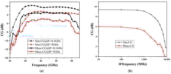 Conversion gain is an important indicator of mixer performance. Conversion gain typically needs to represent as two different frequency characteristics, namely RF input frequency and IF output frequency. Figure 13a shows the comparison of the simulation and test results of conversion gain with RF input frequency for fixed IF frequencies of 0.1 GHz and 5 GHz. The conversion gains are 2.4~6.4 dB (IF frequency of 0.1 GHz) and −1.2~2.45 dB (IF frequency of 5 GHz) in the 30~60 GHz, respectively. Similar to the power characteristics shown in Figure 12 at fixed frequency, due to the inaccuracy of the MOS nonlinear model in the millimeter wave band, the difference between the test and the simulation results on the broadband frequencies is approximately 5 dB. Figure 13b shows the simulation and test comparison of the conversion gain with IF frequency at a fixed RF frequency of 45 GHz, and it can be observed that the conversion gain stabilizes at 5~6 dB at an IF frequency of 0.01~1 GHz and gradually decreases at an IF frequency of 1~10 GHz.