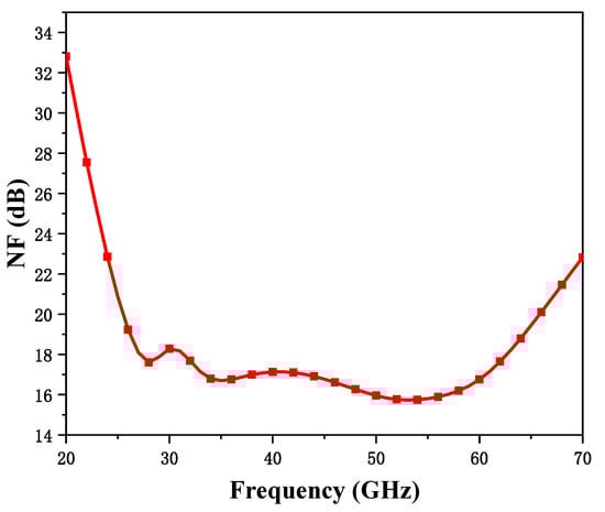 The simulation results of the noise figure of the mixer are shown in Figure 15, with a fixed RF frequency of 45 GHz, an IF frequency of 100 MHz, and a noise figure of 15.7 to 18.2 dB. This noise figure is not very excellent, but a low-noise amplifier will be front-loaded to improve the noise performance of the entire receiver system.