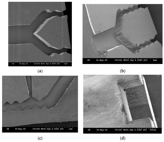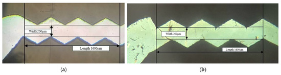 Potassium hydroxide (KOH) wet etching is one of the popular techniques in silicon bulk micromachinings to etch single-crystalline silicon (SCS) in a selective manner. It makes use of the anisotropic properties of SCS etching in KOH, where the crystallographic orientation has a major impact on the etch rate variation. This makes it possible to create accurate, well-defined geometric constructions with predetermined proportions and forms. A protective masking layer—typically silicon dioxide or silicon nitride—is patterned onto the wafer’s surface. Depending on the orientation and pattern of the mask, the etch rate is the quickest in the crystallographic direction, resulting in the production of pyramidal pits or V-shaped grooves [21]. In this study, KOH etching is not used to make specific V-grooves but to trim out the edge debris caused by the previous picosecond laser cutting process. Because most of the SCS surface, except for the laser-cut edge debris, was protected with SiO2, KOH etching only occurred on the edge debris, and it is a maskless process. The temperature, etching duration, and KOH concentration are 60 °C, 19 min, and 33 weight %, respectively. The etching rate of SCS on the {100} surface was calculated as 0.63 μm/min, and the etched width of the SCS including the edge debris was measured as 12 μm [17,18].