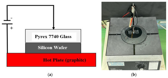 Anodic bonding is a wafer bonding technique used to produce a hermetic seal between silicon and glass substrates. It is sometimes referred to as electrostatic bonding or field-assisted bonding. Because of its strong binding strength, excellent dependability, and compatibility with a variety of materials, it is a process that is frequently used in MEMS. Pyrex 7740 (Changsha Anole Precision Glass Co., Ltd., Hunan, China), a glass that is most frequently used in this method, is recognized for having electrical and thermal characteristics that make it perfect for anodic bonding with silicon. As shown in Figure 3, the glass side is the negative electrode, and the silicon side is the positive electrode of a wafer stack that is subjected to a high DC voltage, often set as 850 V. The assembly is heated to a temperature of 450 °C simultaneously (with a glass thickness of 500 μm). Generally speaking, anodic bonding takes a few minutes for 4-inch wafers. Recently, Corning Corp. (Corning, NY, USA) stopped the production of Pyrex 7740 glass. Eagle XG glass substrates can also undergo the anodic bonding process but need more strict bonding conditions [26].
