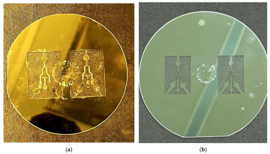 Third, there are many microfluidic chips, and their manufacturing process applies to the field of BioMEMS or microfluidics [12,13]. The general polydimethylsiloxane (PDMS) microchannel process includes the fabrication of microfluidic mold cores, PDMS casting/demolding, and room temperature bonding with glass substrates. The last two parts, PDMS casting/demolding, are shown in Figure 1h–n, and they do not require an ultraclean laboratory environment; only a laminar flow hood, deionized (DI) water, a nitrogen gas gun, and some chemicals are needed. The plasma surface treatment machine required for PDMS bonding with the glass substrate at room temperature is shown in Figure 1o,p; it is a stand-alone vacuum chamber that can be operated in a general air-conditioned laboratory. Only as the microfluidic mold is made, it generally adopts the SU-8 thick photoresist process, and the clean room equipment used for photolithography is still indispensable. In addition, 3D-printed PDMS molds [14], which are good for screw-like or spiral molds, provide another possibility for fabricating nonplanar PDMS microchannels.